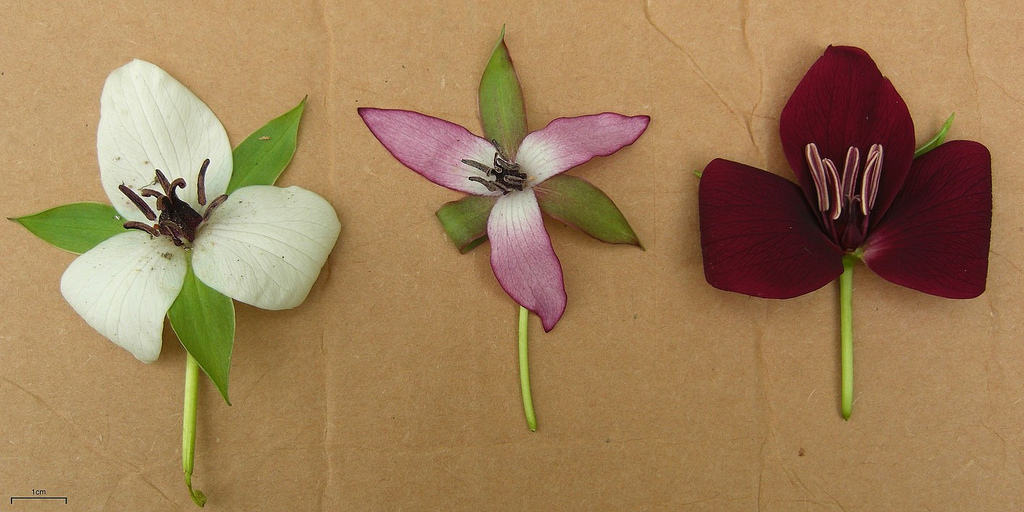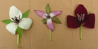 Photo: (from the left) Trillium simile, hybrid Trillium simile x vaseyi, Trillium vaseyi, Jason Hollinger