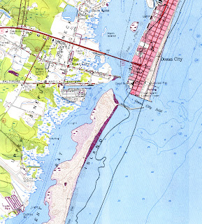 The above map represents the Ocean City, Maryland area. The inlet can be observed separating Ocean City to the north from Assateague Island to the south. Sinepuxent Bay meets the inlet at its north end and Assawoman Bay meets the inlet at its south end.